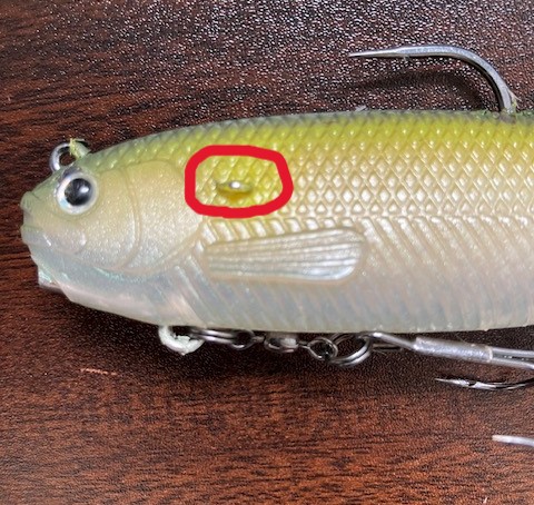 ネイルシンカーを入れる場合は、スイムベイトの顎部分と、腹部の2か所に0.9~1.8g相当のネイルシンカーを入れておくことが基本となります。